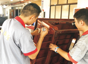 御乾堂紅木在細節上也體現著高水準,僅刮磨這一道工序就有平磨、花磨、拋光等八道工序和十五個作業標準,種種體現出生產管理規范化。